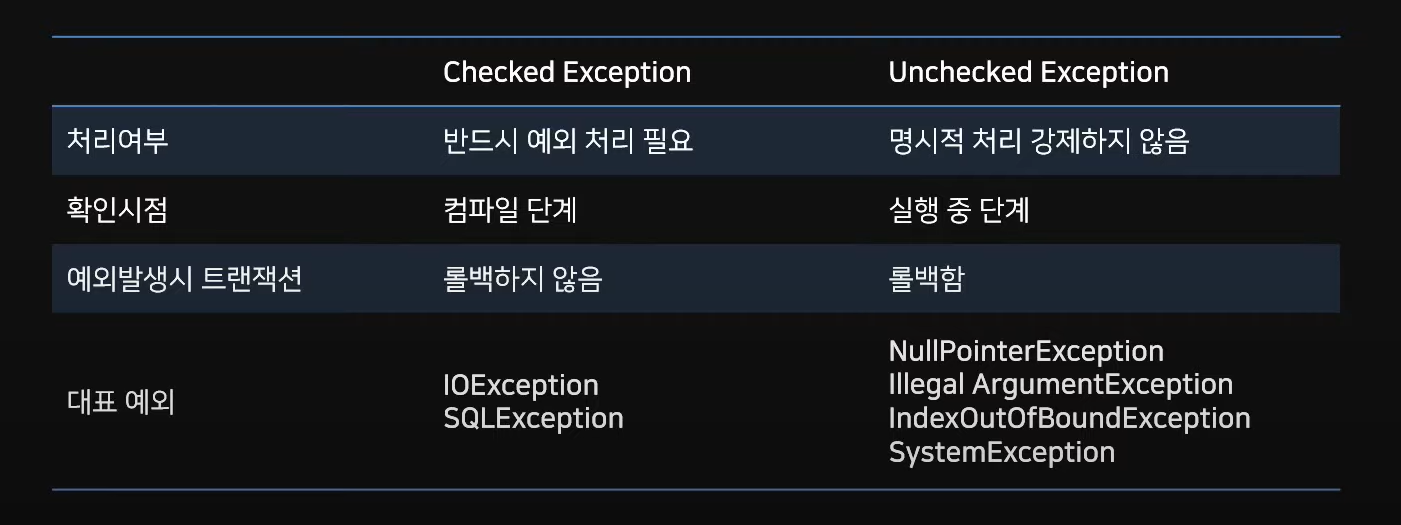 - RuntimeException은 Unchecked Exception 그 외의 Exception은 Checked Exception으로 볼 수 있다.